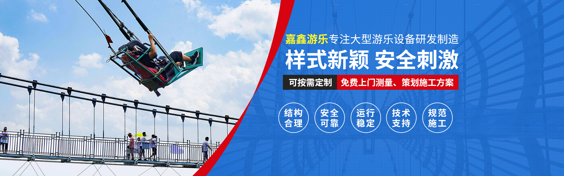 新鄉市嘉鑫游樂設備有限公司是旅游景區、公園、游樂場的游樂規劃向導。公司主要提供滑索、吊橋、水上項目、叢林飛躍、空中自行車、滑道、拓展等游樂設施的制造、安裝、維修及銷售業務。另有景區規劃設計、景觀設計、景點打造、滑漂線路勘察設計等工程咨詢服務?! 」景凑宅F代企業制度運作,設置精干的管理骨架培養“敬業、務實、超越”的團隊精神,不斷完善人才激勵與競爭機制,建立和完善了科學的管理體系。公司技術力量雄厚、配套設施齊全?! 」颈姓嬲\服務客戶的宗旨、完善的服務、豐富的施工經驗及迅捷的手續辦理能力,贏得了大批的客戶和口碑。選擇嘉鑫,請您放心,我們會用完善的服務換取您的滿意?! 」咀裱百|量過硬、守信合同”的經營宗旨,奉行“誠信為本、奉獻...